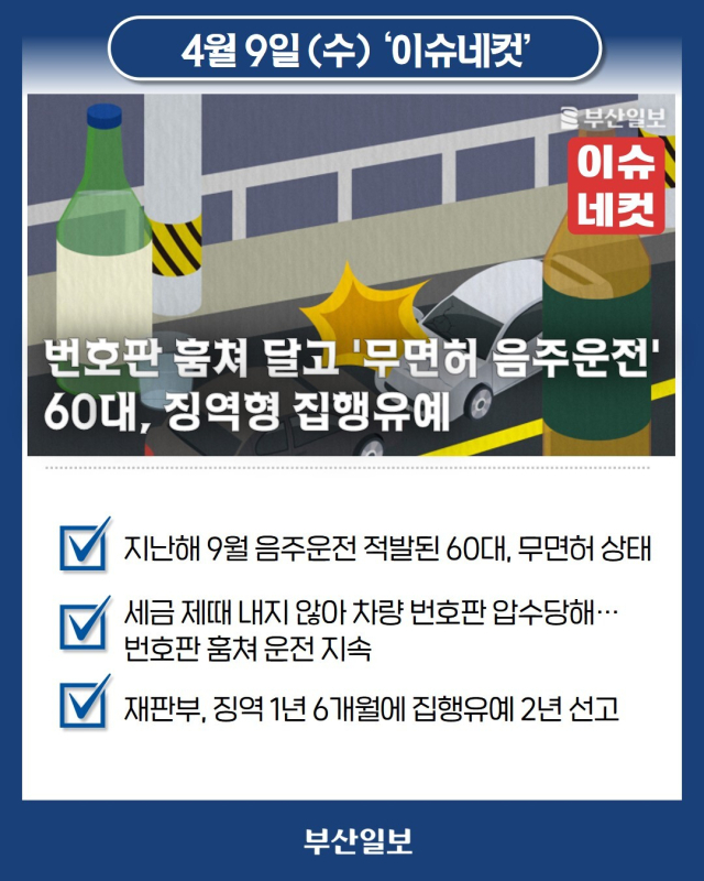 번호판 훔쳐 달고 '무면허 음주운전' 60대, 징역형 집행유예