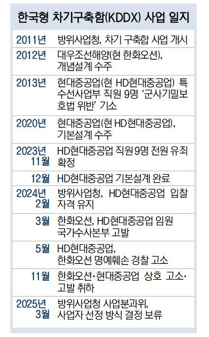 반면 한화오션은 경쟁입찰을 주장한다. HD현대중공업의 ‘군사기밀보호법 위반’ 전력 때문이다. 앞서 현대중공업 직원 9명은 2012년부터 2015년까지 해군본부와 방위사업청을 방문해 기밀 자료를 몰래 촬영한 뒤 이를 미인가 서버에 보관한 혐의로 유죄 판결을 받았다. 방사청은 보안사고 감점 규정을 근거로 HD현대중공업에 올해 11월까지 무기 체계 제안서 평가에서 1.8점을 감점하기로 했다. 소수점 단위로 승패가 갈리는 수주전에서 이는 치명적인 페널티다.