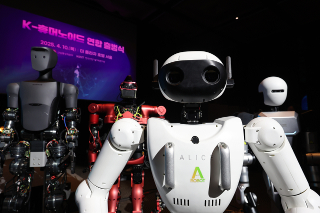 10일 서울 중구 플라자호텔에서 열린 ‘K-휴머노이드 연합 출범식’에 에이로봇, 레이보우로보틱스, 로브로스, 블루로빈의 휴머노이드 로봇이 전시돼있다. 연합뉴스