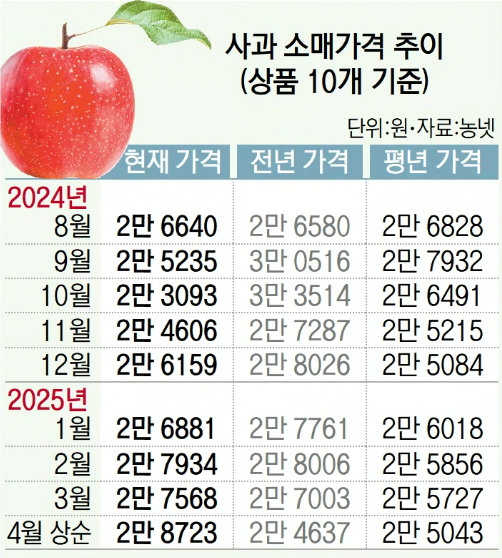 문제는, 올해 재배면적 전망치에 지난달 경북 산불로 인한 피해는 반영되지 않았다는 점이다. 보고서는 “영남 지역 사과 주산지 산불 피해로 향후 재배면적 변동이 가능하다”고 덧붙였다.