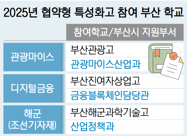 부산관광고는 동서대, 부산관광공사, 부산컨벤션산업협회 등과 협력해 지역 관광산업에 특화된 인재를 양성한다. 부산진여상은 부산은행과 한국해양대 등과 함께 금융 분야 중심의 교육 과정을 구상 중이다. 부산해군과학기술고는 해군본부, 삼덕통상, 한국해양대 등과 연계해 부사관 진로는 물론, 조선기자재 산업과 연계한 해양 특화 교육을 운영할 계획이다.