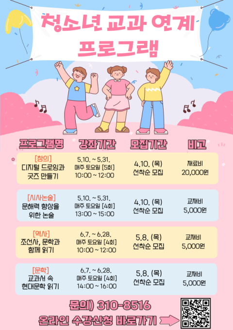 이 프로그램은 청소년들의 교과 내용 보충과 전반적인 학습 경험 확장을 위한 프로그램으로 △창의·창작-디지털 드로잉과 굿즈 만들기 △시사·논술-문해력 향상을 위한 시사논술 △한국사-조선사·문학과 함께 읽기 △문학-교과서 속 현대문학 읽기 등 총 4개의 프로그램으로 각 5회, 4회로 구성된다.