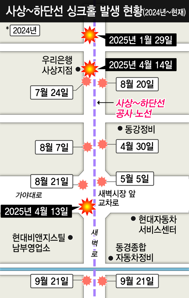 지난 13일 부산 사상구에서 깊이 4~5m의 대형 싱크홀(땅꺼짐)이 발생한지 하루 만에 바로 인근에서 또다시 싱크홀이 발생했다. 두 현장 모두 부산도시철도 사상~하단선 공사 구간으로 시민들의 ‘발 밑 공포’가 극에 달하고 있다. 이 구간에선 2023년부터 지금까지 14번의 싱크홀이 발생할 정도로 사고가 빈발하지만 그 동안 관련 기관들의 수습책이 별다른 효과가 없어, 부산시 등의 정밀조사와 특단의 대책이 필요하다고 전문가들은 입을 모은다.