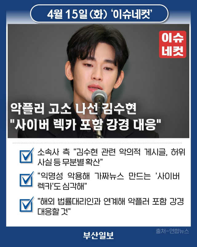 배우 김수현의 소속사 골드메달리스트가 악성댓글 작성자들을 고소했다고 알렸습니다. 15일 김 씨 소속사 측은 "김 씨를 향한 악의적 게시글과 댓글, 허위 사실 등이 온라인상에 무분별하게 게시 및 확산하고 있다"며 "(작성자들을) 지난 14일 정보통신망법상 명예훼손죄 및 형법상 모욕죄 혐의로 수사기관에 고소장을 제출했다"고 밝혔습니다. 또 "익명이라는 점을 이용해 가짜뉴스를 만들고 사이버불링을 초래하는 영상 및 숏츠를 제작하는 '사이버 렉카'의 행태도 심각하다"면서 "최근 사이버 렉카의 신원이 밝혀지고 법적 대응이 이뤄지고 있는 만큼 당사 역시 해외 SNS 플랫폼에 대해서도 해외 법률대리인과 연계하여 강경 대응할 것"이라고 강조했습니다. 소속사 측은 "아티스트의 명예를 훼손하는 악성 게시물들에 대한 추가 고소를 이어 나갈 예정이며, 앞으로도 명백한 범죄 행위에 대해서 강력한 법적 조치로 아티스트의 권리 보호에 최선을 다하겠다"고 덧붙였습니다. 앞서 김 씨는 유튜브 채널 가로세로연구소가 고(故) 김새론 유족과의 통화를 인용해 '김 씨가 2015년, 당시 15세였던 김새론과 6년간 교제했다'고 주장하면서 논란에 휩싸였습니다. 이에 김 씨 측은 "김새론과 교제한 사실은 맞지만, 미성년자였던 시절부터 사귄 것은 아니다"라고 반박했습니다. 가세연 운영자 김세의 씨와 김새론 유족에 대한 법적 대응에 나서기도 했습니다.
