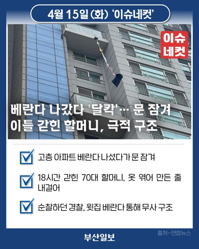 베란다 나갔다 '달칵'… 문 잠겨 이틀 갇힌 할머니, 극적 구조 [이슈네컷]