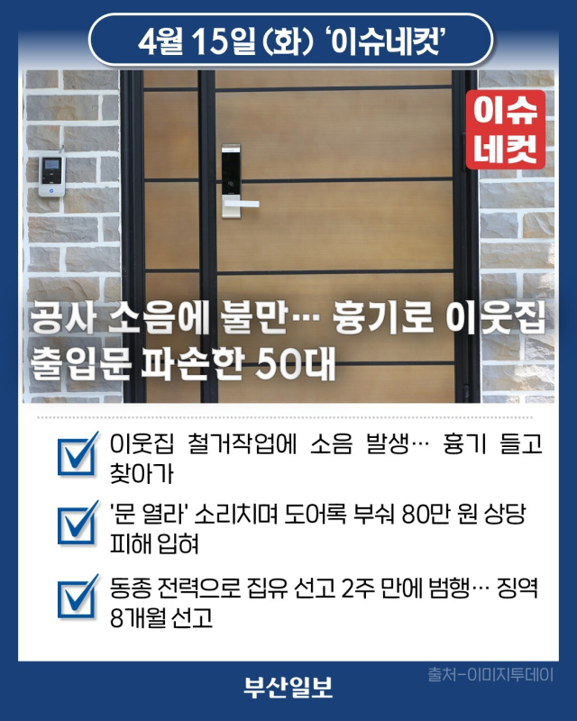 공사 소음에 불만… 흉기로 이웃집 출입문 파손한 50대
