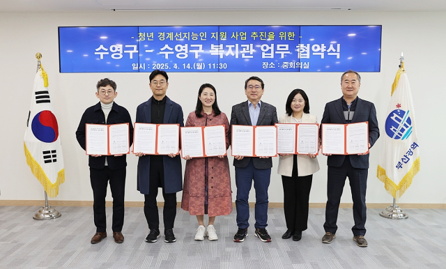 부산 수영구(구청장 강성태)는 지난 14일 수영구 소재 부산종합사회복지관, 홀트수영종합사회복지관, 수영구장애인복지관, 수영구노인복지관, 광안노인복지관과 청년 경계선 지능인 취업 프로젝트 추진을 위한 업무 협약을 체결했다.