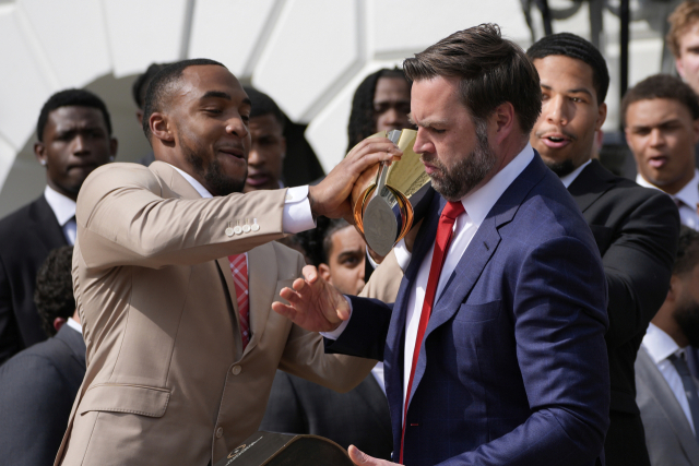 14일(현지 시간) JD 밴스(오른쪽) 미국 부통령이 미국 워싱턴 DC 백악관 남쪽 잔디밭에서 2025 전미 대학 풋볼 챔피언인 오하이오 주립대 선수를 환영하는 자리에서 우승 트로피를 들어 보이려다 반토막 나자 깜짝 놀라고 있다. 오하이오 주립대 트레베용 헨더슨 선수가 가까스로 트로피 윗부분을 잡았다. AP연합뉴스