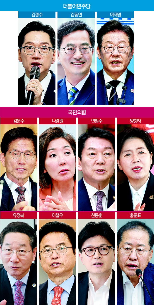 16일 정치권에 따르면, 민주당은 이재명 전 대표와 김동연 경기지사, 김경수 전 경남지사 간 경선이 확정됐다. 국민의힘은 김문수 전 고용노동부 장관, 나경원 의원, 안철수 의원, 양향자 전 의원, 유정복 인천시장, 이철우 경북지사, 한동훈 전 대표, 홍준표 전 대구시장(가나다순) 등 8명이 경쟁을 펼친다. 민주당과 국민의힘은 이르면 이달 말부터 내달 초 사이에 경선을 거쳐 최종 당 대선 후보를 확정한다.