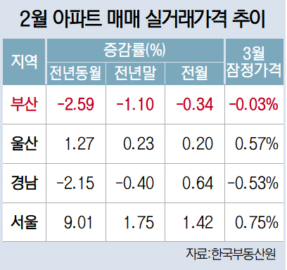 아직 최종 확정된 것은 아니지만 한국부동산원이 잠정 집계한 3월 실거래 가격은 부산은 0.03% 하락한 것으로 나왔다. 하락폭이 2월에 비해선 많이 줄어든 것이다. 또 울산은 0.57% 오르고 경남은 0.53% 각각 하락했다.