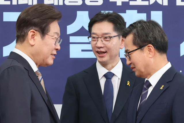 더불어민주당 대선후보 경선 주자인 이재명 전 대표(왼쪽부터), 김경수 전 경남지사, 김동연 경기지사가 16일 서울 여의도 국회에서 열린 공명선거 실천 서약식을 마친 뒤 대화하고 있다. 연합뉴스