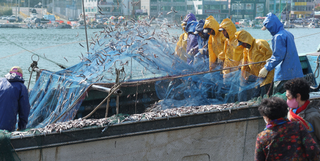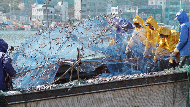17일 부산 기장군 대변항에서 조업을 마치고 입항한 멸치잡이 어선에서 어민들이 싱싱한 멸치를 털어내고 있다. 부산의 대표적인 봄 축제인 ‘기장멸치축제’는 지난해 어촌 인력 고령화와 재정 문제 등으로 취소됐지만 올해 다시 재개돼 오는 25일부터 사흘간 대변항 일원에서 개최된다.