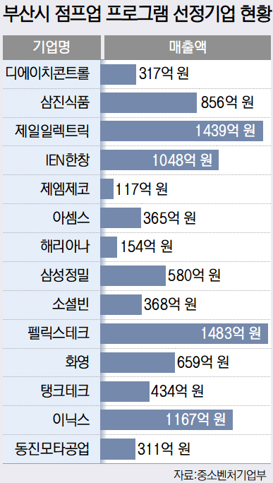중소벤처기업부는 글로벌 중견기업으로 성장할 가능성이 큰 유망 중소기업 100개 업체를 선발해 ‘점프업 프로그램’을 진행한다고 17일 밝혔다. 선발 문턱은 매우 높았다. 1단계 서면 평가와 현장실사를 통한 기술력과 사업성 심사, 2단계 분야별 전문가 심층토론이 진행됐다. 참여를 희망한 업체는 무려 620곳. 이 중 100개만이 선발됐다. 그 중 무려 14개 업체가 부산에 본사를 두고 있는 업체다. 수도권 41곳 등에 비하면 숫자는 작지만 경제 규모를 생각하면 엄청난 성과다.