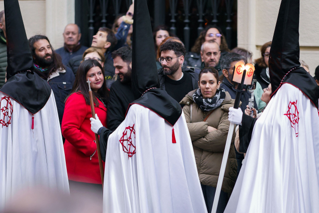 14일(현지 시간) 스페인 북서부 도시 사모라에서 젊은이들이 ‘비아 크루시스의 예수’ 형제단의 성월요일(Holy Monday) 행진을 지켜보고 있다. 성월요일은 부활절 1주일을 앞둔 주의 첫 월요일을 뜻한다. 사모라에는 각각 수백에서 수천 명의 회원을 보유한 16개의 형제단이 있다. AFP연합뉴스
