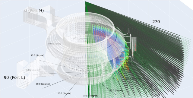 그림. 광학 진단용 시뮬레이션 결과. 광학 진단 장비에서 토카막 내부로 향하는 광선(ray)들을 가상으로 생성해, 토카막 장치 내부의 구조물에 의해 시야가 어떻게 차단되거나 확보되는지를 시각화한 결과다. 광학 장비의 구경(aperture)에서 방출되는 해당 광선들은 장비가 수집하는 빛의 경로를 나타내며 초록색으로 시각화함. 광선이 용기 내벽과 교차하는 지점(빨간색 점으로 표시)은 시야가 차단되기 시작하는 경계를 의미한다. 이 분석 도구는 시야가 확보된 영역 내의 플라즈마 파라미터(예: 스펙트럼 색상으로 표현된 자기장 분포)를 선택적으로 추출함으로써 계산 효율성을 향상함. UNIST 제공