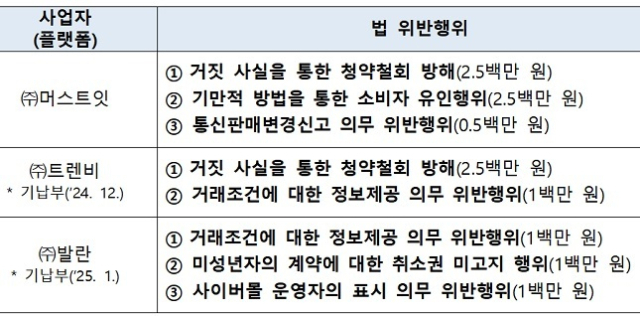 또 상품 하자나 오배송 등 계약 내용과 다르게 이행된 경우에도 7일 이내에만 청약철회가 가능한 것처럼 안내해 청약철회 기간을 전자상거래법에서 규정한 3개월보다 대폭 줄여 정당한 청약철회를 방해했다.