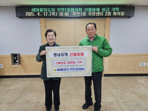 부산진구 새마을지도자부전1동협의회(회장 여운경)는 지난 17일 영남지역에서 발생한 대형산불 피해 지원을 위한 성금 30만 원을 부전1동(동장 하기수)에 전달했다.
