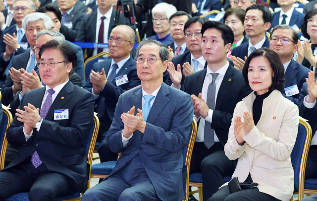 한덕수 대통령 권한대행 국무총리가 21일 서울 강남구 한국과학기술회관에서 열린 '2025년 과학·정보통신의 날 기념식'에서 박수치고 있다. 연합뉴스