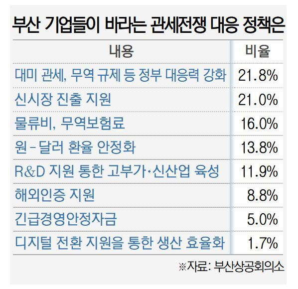 미국 트럼프 행정부의 관세 정책으로 인해 미국으로 수출하는 부산 기업들이 현지로부터 단가 인하 압박을 받는 등 실제 피해를 입고 있는 것으로 나타났다. 부산 기업들은 패권 전쟁에 따른 미 행정부의 고관세 부과에 기업 차원에서 대응하기는 어렵다고 호소하면서, 정부 차원에서 물류비용 지원과 관련 정보를 기업들과 수시로 공유해 줄 것을 요청했다.