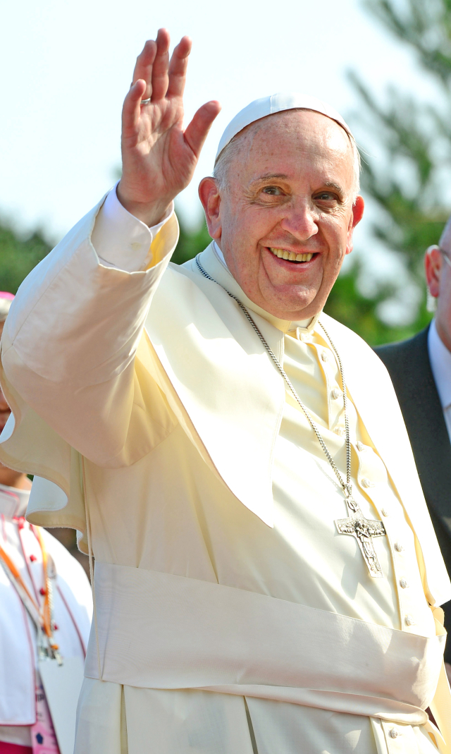 프란치스코 교황이 21일(현지시간) 오전 88세로 선종했다고 교황청이 발표했다. 프란치스코 교황은 즉위 이듬해인 2014년 8월 14일부터 18일까지 4박 5일 일정으로 한국을 찾아 평화와 위로 그리고 화해의 메시지를 전했다. 사진은 2014년 8월 15일 충남 당진 솔뫼성지를 찾아 신자들에게 손을 들어 인사하는 교황 모습. 연합뉴스