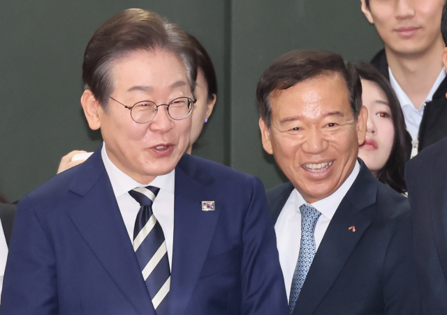 더불어민주당 이재명 대선 경선 후보가 21일 서울 여의도 금융투자협회에서 열린 자본시장 활성화를 위한 정책간담회에 서유석 금융투자협회장(오른쪽)과 참석하고 있다. 연합뉴스