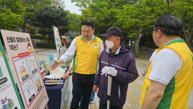 첫 캠페인 활동은 지난19일 오전 7시 30분부터 10시까지 진행됐다. 장산을 찾은 등산객 200여 명을 대상으로 산불 피해 사진전, 산불 발생 원인 설문조사, 산불 예방 행동 요령 안내 등 다채로운 프로그램을 통해 시민 참여를 유도했다. 캠페인 현장에서는 산불 예방 스티커가 부착된 물티슈와 홍보 책자도 함께 배포됐다.
