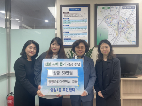 국공립 양정중앙어린이집(원장 오정화)의 원장, 학부모 및 교직원 대표가 함께 23일 부산진구 양정1동(동장 손혜숙)를 찾아 영남 지역 대형 산불 피해 돕기 성금 50만 원을 전달했다.