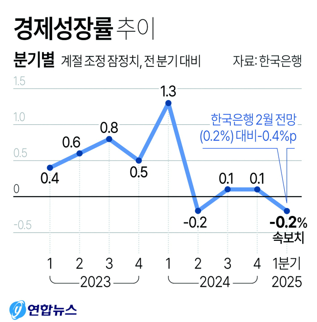 한은은 1분기 실질 국내총생산(GDP) 성장률(직전분기대비·속보치)이 -0.2%로 집계됐다고 24일 발표했다. 이는 한은의 지난 2월 공식 전망치 0.2%보다 0.4%포인트(P)나 낮은 수준이다.