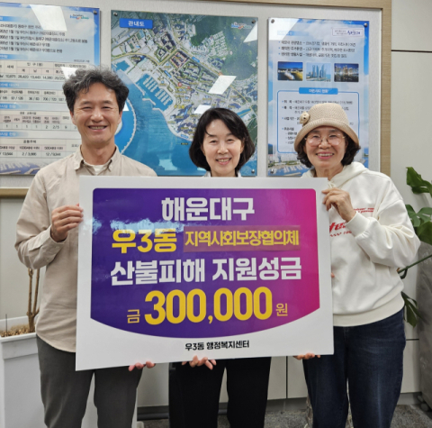 해운대구 우3동 지역사회보장협의체(민간위원장 김부란)는 산불로 피해를 입은 경북 지역 이재민들의 피해 복구를 위해 30만 원을 기탁했다.