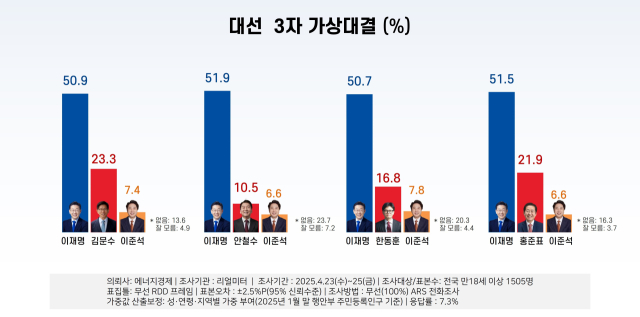 이재명 후보는 3자 가상대결에서 50.7∼51.9%로 국민의힘 후보군과 27.6∼41.4%p 차이를 보였다. 다만 직전 조사에서 54%대 지지율을 기록한 것과 비교하면 소폭 하락한 것으로 나타났다. 국민의힘 후보군 중에서는 김문수 후보가 23.3%로 3자 가상대결에서 가장 높은 지지율을 확보했다. 이재명 후보와의 격차는 27.6%p였다. 홍준표 후보는 21.9%(격차 29.6%p), 한동훈 후보는 16.8%(33.9%p), 안철수 후보는 10.5%(41.4%p)였다. 이준석 후보 지지율은 6.6∼7.8%로 집계됐다.