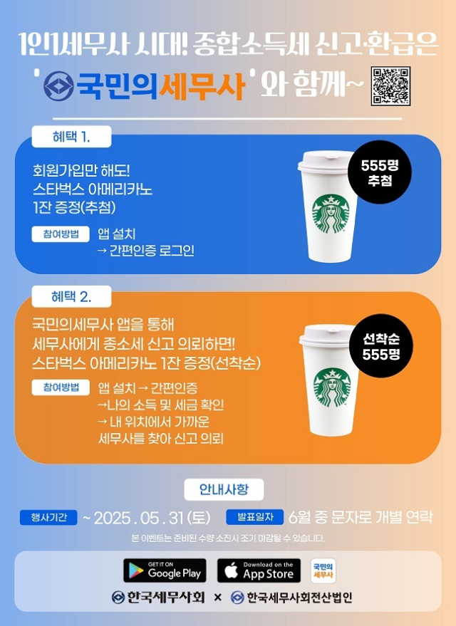 또 ‘국민의세무사’ 앱을 통해 종합소득세 신고를 의뢰한 납세자 555명에게도 선착순으로 커피 기프티콘을 제공하는 이벤트도 진행 중이다. 참여 방법과 자세한 내용은 이벤트 안내 페이지에서 확인할 수 있다.
