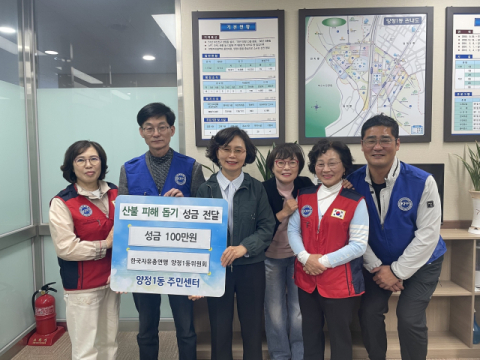 부산진구 한국자유총연맹 양정1동위원회(위원장 이병화)는 28일 양정1동(동장 손혜숙)을 찾아 영남지역 대형 산불피해 이웃돕기 성금 100만 원을 전달했다.