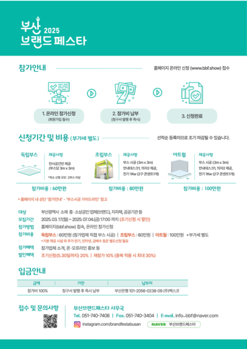 행사 참가를 희망하는 부산 업체는 오는 7월 4일까지 행사 누리집을 통해 신청하면 된다. 5월 30일까지 참가 신청 완료 시, 조기신청 20퍼센트(%) 할인 혜택이 제공된다.