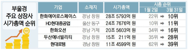 이와 관련, 한국CXO연구소 오일선 소장은 “올 1월 초 대비 3월 말 기준으로 보면 부울경 소재 주식종목의 시총이 20% 넘게 증가한 것은 매우 괄목할만한 성장”이라며 “특히 한화에어로스페이스를 비롯해 한화오션, 한화엔진을 포함한 한화 그룹 계열사와 현대로템과 현대위아 등의 현대차그룹 계열사 시총 성적이 좋아진 것이 부울경 시총 상승에 중요한 역할을 했다”고 말했다.