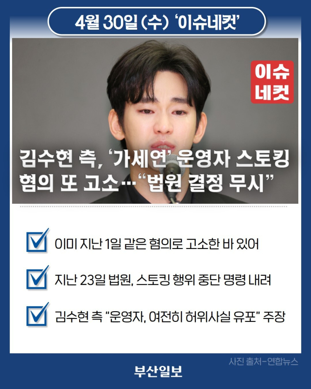 사생활 논란에 휩싸인 배우 김수현 씨가 유튜브 채널 '가로세로연구소'(이하 가세연) 운영자를 추가 고소했습니다. 김수현 씨와 소속사 골드메달리스트의 법률대리인인 법무법인 엘케이비앤파트너스는 가세연 운영자 김세의 씨를 스토킹처벌법 위반 혐의로 추가 고소했다고 30일 밝혔습니다. 김수현 씨 측은 "배우에 대한 지속적이고 반복적인 허위사실 유포 행위는 스토킹 범죄에 해당한다"며 이미 지난 1일 김 씨를 같은 혐의로 고소 및 고발한 바 있다고 전했습니다. 이에 지난 23일 서울지방법원은 김 씨에게 스토킹 행위를 중단할 것을 명령하는 잠정조치 결정을 내렸으나, 김 씨가 여전히 김수현 씨에 관한 허위사실을 유포하고 있다고 주장했습니다. 가세연은 지난달 고(故) 김새론 씨 유족과의 통화를 인용하며 김수현 씨가 2015년 당시 15세였던 김새론 씨와 6년간 교제했다고 주장했습니다. 김수현 씨 측은 교제 사실은 인정하면서도 미성년자였던 시절부터 교제한 것은 아니라고 반박하며 김세의 씨 및 김새론 유족에 대한 법적 대응에 나섰습니다. 또 가세연 측을 협박 혐의 등으로 고발하고 거액의 손해배상 소송도 제기했습니다.