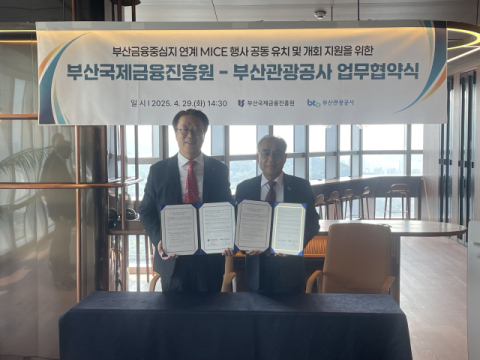 부산관광공사(사장 이정실)와 부산국제금융진흥원(원장 이명호)은 4월 29일 부산국제금융센터(BIFC)에서 ‘부산금융중심지 연계 MICE 행사 공동 유치 및 개최 지원’을 위한 업무협약(MOU)을 체결했다고 밝혔다.