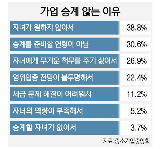 실제 중소기업중앙회가 실시한 ‘2024 중소기업 가업승계 실태조사’에 따르면, 자녀에게 승계하지 않을 경우 기업의 향후 계획을 묻는 질문에 ‘매각’이라고 답한 이가 48.6%에 달했고 ‘폐업’이라는 응답자도 8.3%에 이르렀다. 자녀에게 가업을 승계하지 않으려는 이유로는 ‘자녀가 원하지 않아서’(38.8%)를 꼽은 이들이 가장 많았고, ‘자녀에게 기업 운영이라는 무거운 책무를 주기 싫어서’라는 응답도 26.9%나 됐다.