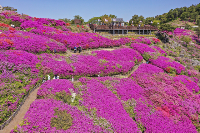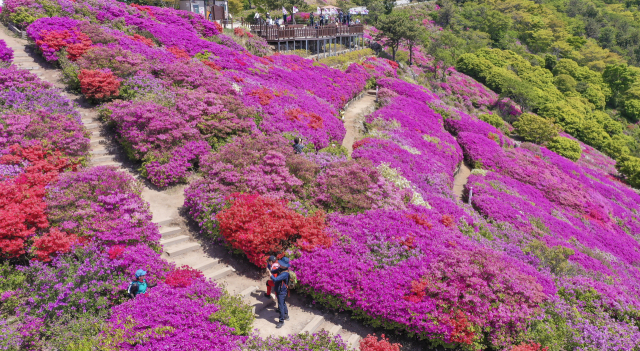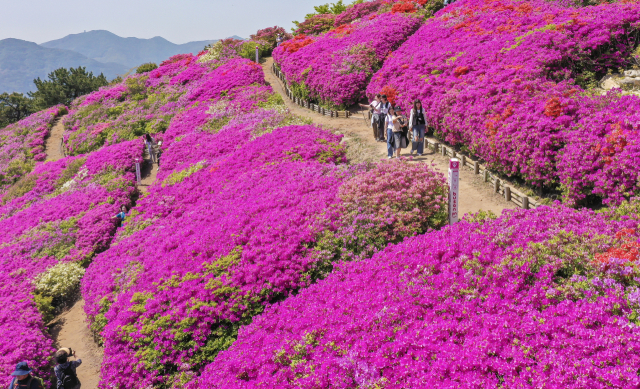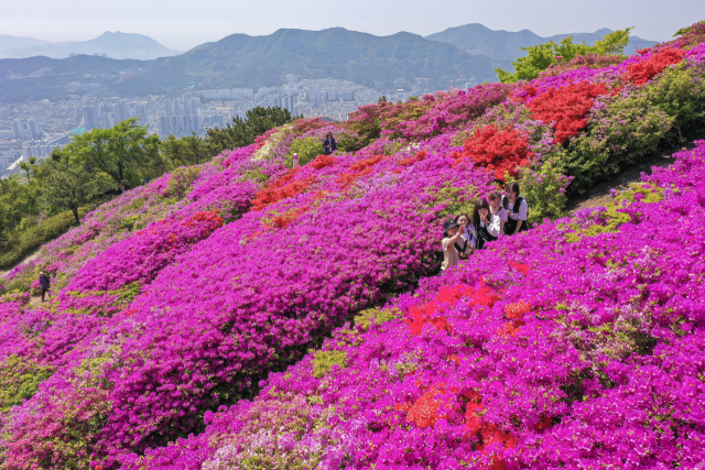 완연한 봄 날씨를 보인 30일 부산 부산진구 백양산 정상 애진봉 철쭉동산을 찾은 등산객들이 만개한 철쭉을 배경으로 사진을 찍고 있다. 부산진구는 1990년 12월 발생한 대형 산불로 민둥산이 된 백양산 정상 부근에 2007년부터 매년 산철쭉을 심어 현재 23만 본의 철쭉동산을 조성했다. 김종진 기자 kjj1761@