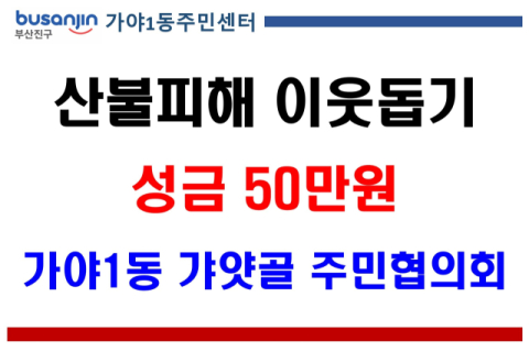 부산진구 가야1동 가얏골 주민협의회(회장 이선호)은 지난달 30일 최근 발생한 산불로 피해입은 지역주민들을 돕기 위해 산불피해 성금 50만 원을 가야1동(동장 신보민)에 전달했다.