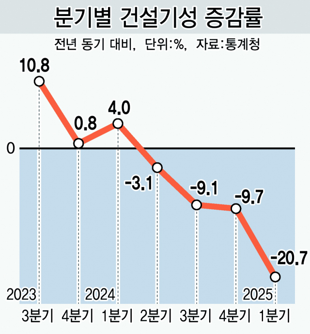 코로나19 확산기였던 2020년 2분기(-3.5%)부터 2022년 1분기(-1.9%)까지 이후 가장 긴 기간 줄고 있다. 수주와 착공 부진 누적에 따른 영향이 본격화하고, 12·3 비상계엄 이후 정치 불확실성 확대 등으로 신규 분양이 축소된 탓이다.