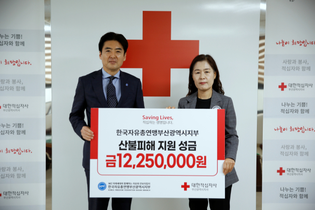 한국자유총연맹 부산광역시지부(회장 신한춘)는 지난달 25일 산불 피해 복구와 이재민 지원을 위해 부산적십자사(회장 서정의)에 성금 1225만 원을 전달했다.
