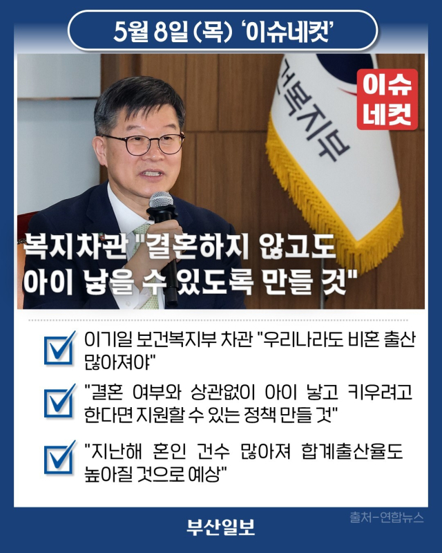 이기일 보건복지부 제1차관이 "결혼하지 않고도 아이를 낳을 수 있는 제도를 만들어 가겠다"고 밝혔습니다. 8일 YTN라디오 '슬기로운 라디오생활'에 출연해 비혼 출산과 관련한 질문에 이같이 답했습니다. 복지부에 따르면 2022년 기준 OECD 국가의 평균 비혼출산율은 41.0%입니다. 나라별로는 프랑스 65.2%, 스웨덴 57.8%, 영국 51.4%, 미국 39.8% 등인데, 같은 해 우리나라의 비혼출산율은 3.9%였고, 2023년에는 4.7%로 소폭 올랐습니다. 이 차관은 "우리나라 사람들은 결혼해야만 아이를 낳는다"면서 "그런 점에서 지난해 혼인 건수가 많아져 합계출산율도 높아질 것"이라고 예상했습니다. 이어 "저출산 문제는 복지부뿐만 아니라 전체 정부 부처, 우리나라 전체의 현안"이라며 저출산 해결 방안의 하나로 결혼하지 않고도 출산할 수 있도록 돕는 제도의 필요성을 강조했습니다. 그는 "우리나라도 비혼 출산이 많아져야 하지 않나 생각한다"며 "결혼 여부와 상관없이 아이를 낳고 키우려고 한다면 지원할 수 있는 정책을 많이 만들겠다"고 덧붙였습니다.