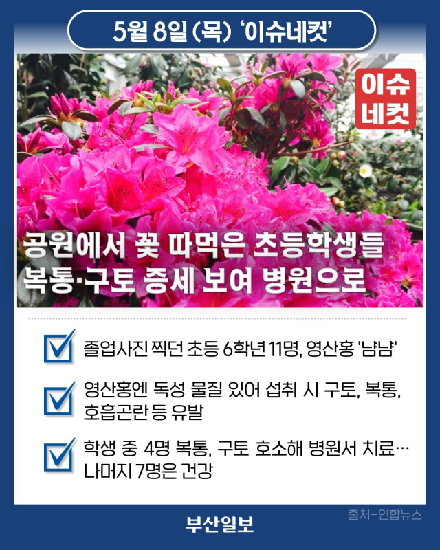경기 안성시의 한 공원에서 진달래과에 속하는 영산홍 꽃을 따다 먹은 초등학생 4명이 복통과 구토 등 증세를 보여 병원에서 치료받았습니다. 8일 경기도교육청 등에 따르면 전날 낮 12시 40분께 안성시의 한 초등학교 보건교사로부터 "복통을 호소하는 학생이 있다"는 내용의 119 신고가 접수됐습니다. 당시 이 초등학교 6학년 학생 11명이 인근 공원에서 졸업앨범을 촬영하던 중 영산홍을 따서 먹었던 것으로 파악됐습니다. 영산홍은 진달래과에 속하는 반상록 관목으로 그라야노톡신이라는 독성 물질이 있어 섭취 시 구토, 복통, 호흡곤란 등을 유발할 수 있습니다. 학생들 중 2명이 복통과 구토 증상을 보여 구급대에 의해 인근 병원에 이송된 뒤 치료받았습니다. 다른 2명도 보호자를 통해 병원에 옮겨졌으며, 이들 모두 생명에는 지장이 없는 것으로 알려졌습니다. 함께 영산홍을 섭취한 나머지 7명은 별다른 증상을 보이지 않았던 것으로 전해졌습니다.