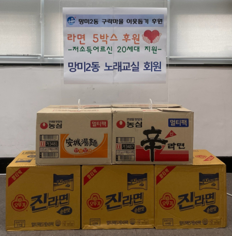 부산 수영구 망미2동 행정복지센터(동장 이은희)는 7일 이름을 밝히지 말아 달라고 요청한 한 망미2동 주민자치회 노래교실 회원이 어버이날이 되니 돌아가신 부모님이 생각난다며 라면 5박스를 후원했다고 밝혔다.