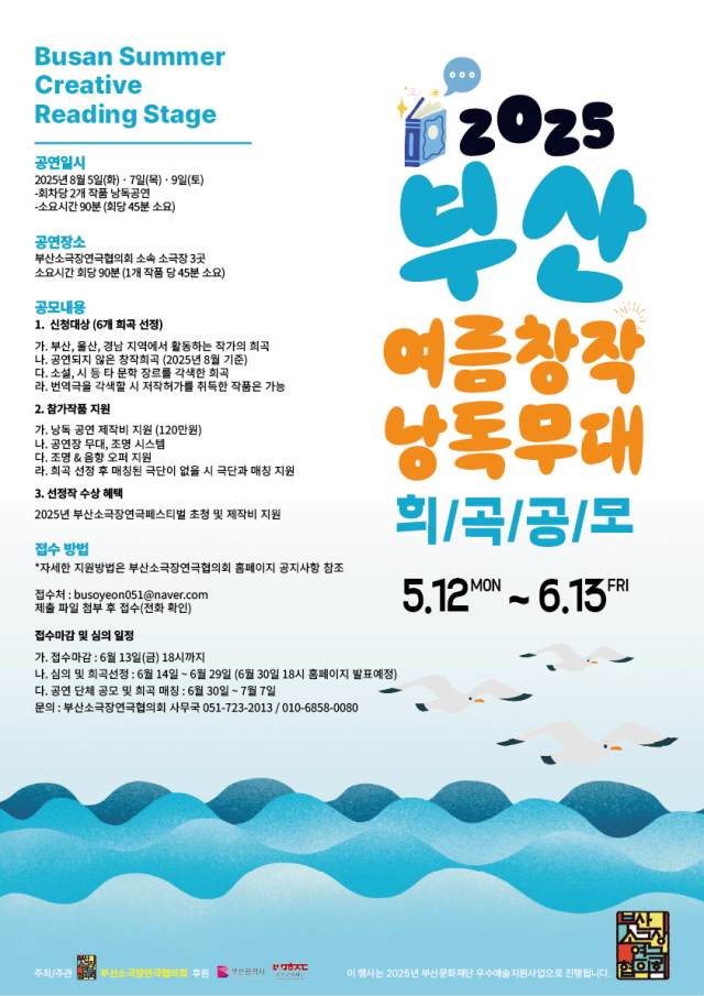 부산의 소극장 단체인 부산소극장연극협의회가 ‘2025 여름창작낭독무대’에 선보일 희곡을 공모한다. 2016년 시작된 여름창작낭독무대는 지역 작가에게 창작 희곡 발표 무대를 제공하고, 연극 비수기인 여름철 소극장 문화 활성화를 위해 해마다 진행하고 있다.