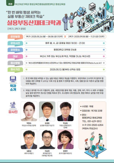 동명대학교 평생교육원은 부산여성가족과평생교육진흥원 주관 ‘2025년 부산시민대학 캠퍼스 학과’ 사업 운영기관으로 최근 선정되었다고 밝혔다. 초고령화 사회에 접어드는 부산시민들에게 안정적 노후 준비를 위한 부동산, 금융에 대한 실용교육을 제공하는 실용 부동산재테크 과정을 운영한다. 강사진은 현직 대학교수 및 세무사, 법무사 등 최고 강사진으로 구성되어 있다. 1학기(5월-7월)는 실용부동산재테크학과Ⅰ, 2학기(9월-11월)는 실용부동산재테크학과Ⅱ로 운영한다. 강의는 매주 월, 수, 금요일(18:30~21:30)에 한다.