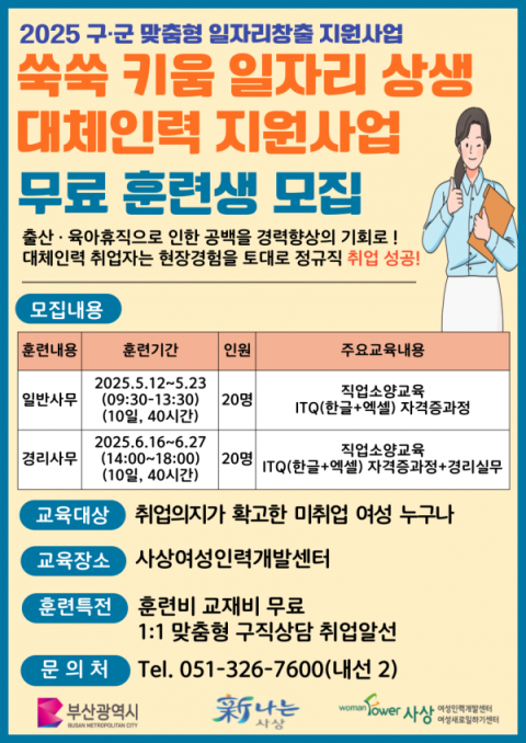 사상여성인력개발센터가 ‘쑥숙 키움 일자리 상생 대체인력 지원사업’ 기초직무훈련 교육생을 모집한다.
