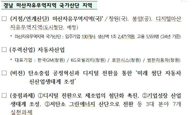마산자유무역지역 국가산단 중심으로 미래자동차부품 자율제조 공정개선, 미래형 자동차 핵심융합부품 기술혁신 인재양성 사업 등을 통해 ‘미래 첨단 자동차 신산업 생태계’를 조성해 나갈 계획이다.