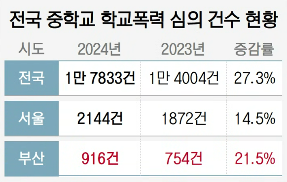 종로학원이 학교알리미에 공시된 전국 중·고등학교 5675곳의 학교폭력 자료를 분석한 결과, 지난해 전국 중학교에서 발생한 학교폭력 심의 건수는 1만 7833건으로, 2023년 1만 4004건보다 27.3% 증가했다. 부산은 같은 기간 754건에서 916건으로 21.5% 늘었다.
