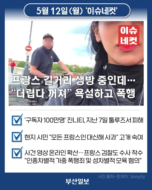 트위치(인터넷 방송 플랫폼)에서 100만명 넘는 구독자를 보유한 한국인 여성 스트리머 '진니티'가 지난 7일 프랑스 남부 툴루즈에서 생방송 도중 인종차별성 공격을 당했습니다. 당시 진니티 뒤로 전동 킥보드를 탄 한 남성이 다가오더니 "뭘 원하냐. 더러운 XX. 꺼지라"고 욕설하고 휴대전화까지 손으로 가격한 뒤 사라졌는데요. 실시간으로 중계된 이 장면은 온라인상에서 급속도로 퍼져나갔고, 소식을 접한 프랑스인들이 진니티에게 사과와 위로의 댓글을 남겼습니다. 심지어 오토바이를 타고 가던 한 현지인은 길에서 진니티를 발견한 뒤 "모든 프랑스인을 대신해 어제의 공격에 대해 사과드린다"며 상반신을 여러 차례 숙여가며 사과했습니다. 해당 영상을 접한 툴루즈 검찰도 "이 사건이 인종차별적 가중 폭행죄와 성차별적 모욕 혐의로 다뤄질 수 있다"면서 가해 남성에 대한 수사를 개시했습니다.
